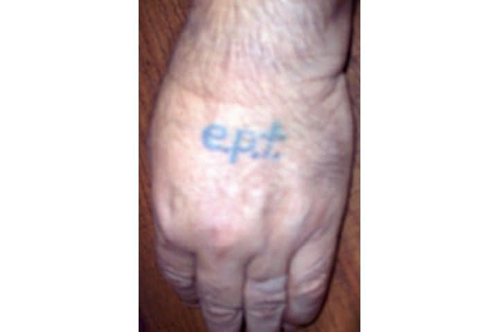 EPT is not a pregnancy test. At least not on this guy's hand. It stands for the "El Paso Tip," which formed in Texas before the Mexican Mafia. The 1940's Pachucos from Texas would tattoo "ept" or just "t" for "the Texas Tip." California pachucos used the tattoos "LA" for "Los Angeles" and "M" for "Maravilla" and later for "Mexican Mafia."
