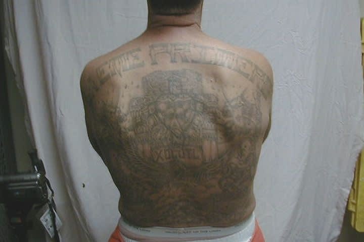 This tattoo is on a member of one of Fresno, Calif.'s oldest criminal street gangs, the Fresno Bulldogs. They were once part of the founding Norteno alliance under the Nuestra Familia, but they split from NF. They are now not affiliated with either Nuesta Familia or the Mexican Mafia.