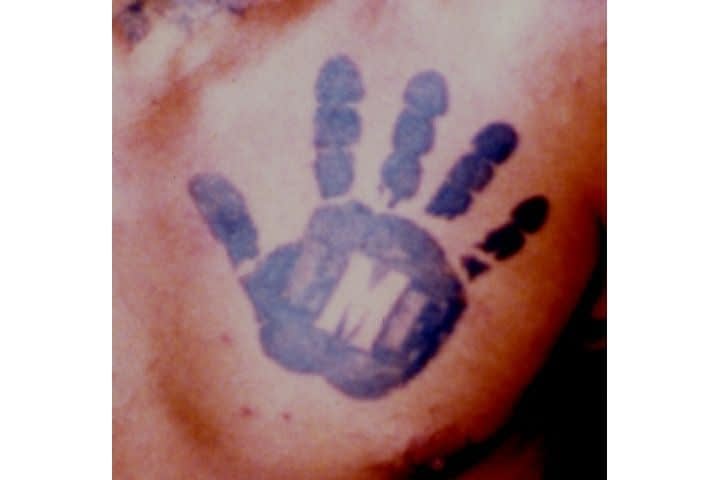 Another Mexican Mafia tattoo with an open hand referencing the "black hand of death." The scars on this inmate are from prison stabbings.