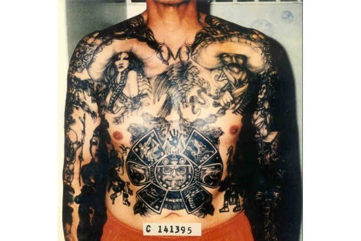 The elaborate tattoo of the Aztec calendar on this inmate is a common symbol on many Hispanic prisoners. Much more significant is the "M" just below his throat, which marks him as a member of "La Eme", the Mexican Mafia prison gang. Also note that the snake in the eagle's beak is in the shape of an "M."