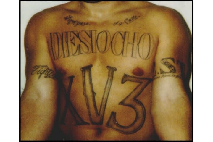 An 18th Street gang member's tattoo displaying "18" in Roman numerals and the Spanish word for that number, "dieseocho," spelled out prominently.
