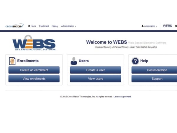 Web-Based Biometric Software (WEBS) from CrossMatch is the first completely Web-based approach for the collection of biometric enrollment data. The WEBS architecture leverages a secure central server that interfaces with workstations, thin client terminals, and enabled network devices. This approach simplifies installation, streamlines implementation, and provides a single touch-point for application administration, maintenance, and updating. Features include: enhanced privacy and security since no personal data is stored locally, no local implementation or deployment costs, centralized administration, configurable platform, and online help wi