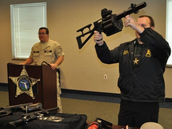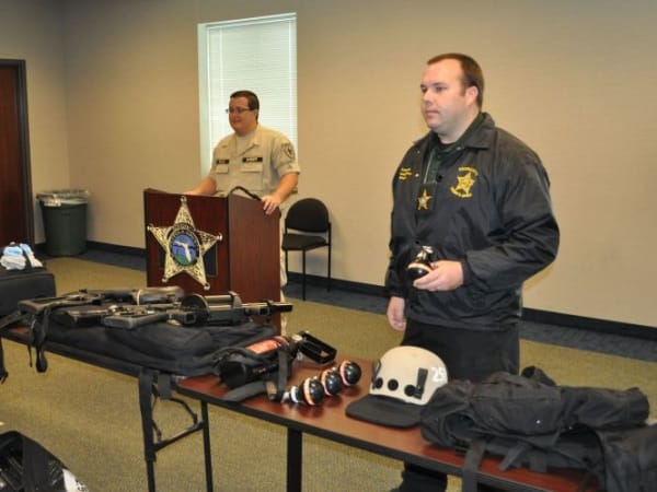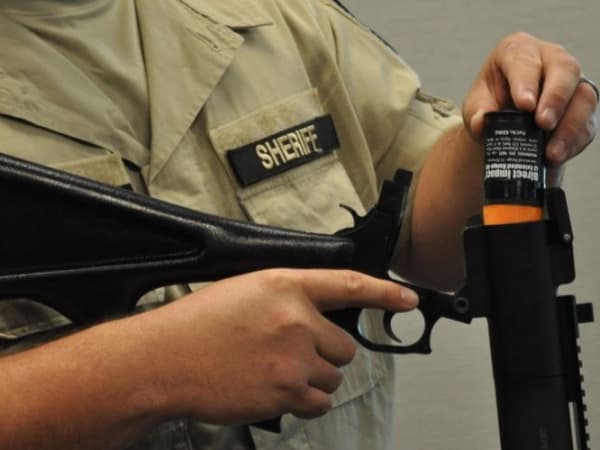 A sheriff's deputy loads a single-shot 40 mm round into a launcher.