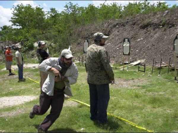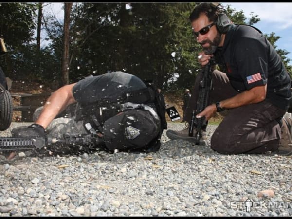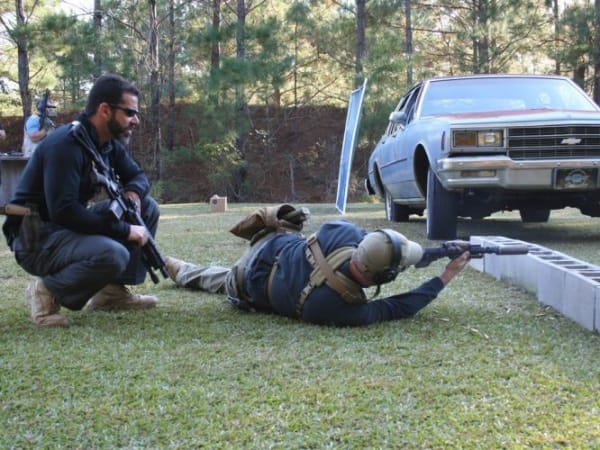 Magpul instructor Chris Costa offers instruction to a student shooting from a prone position behind a barricade of cinder blocks that similuate a curb. The position may be employed during an active shooter incident.
