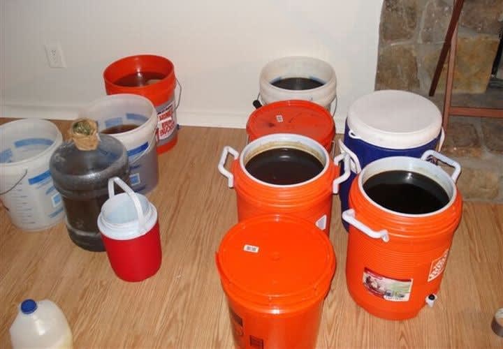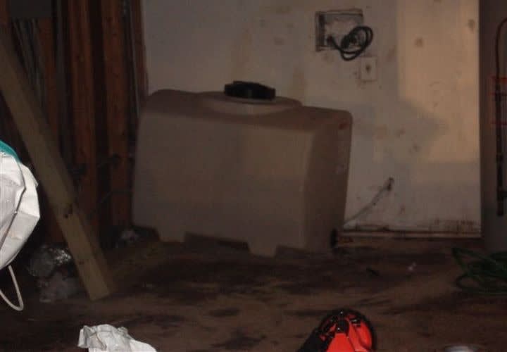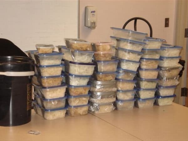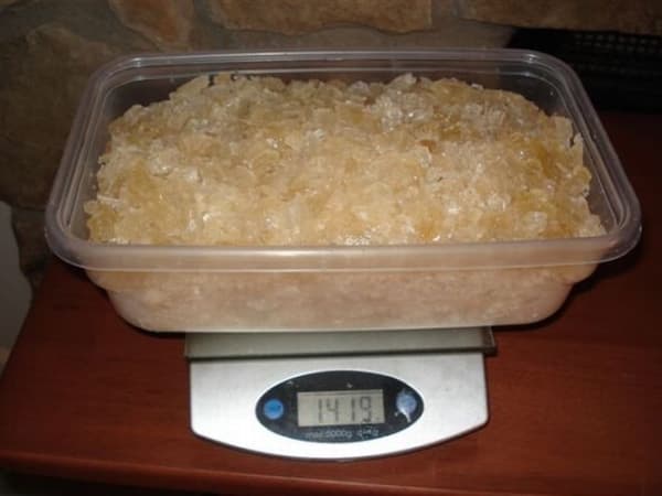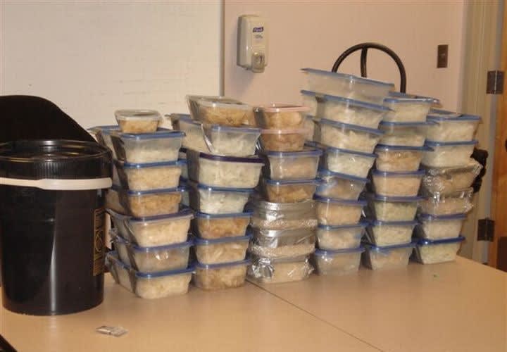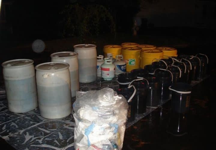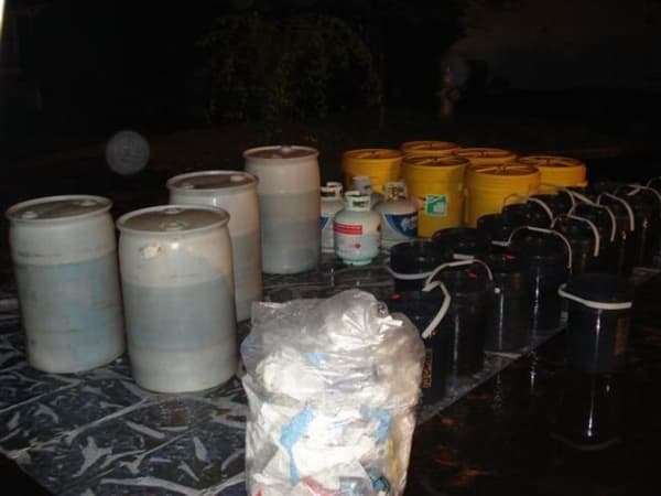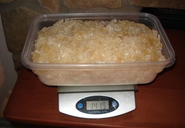 A closer look at an evidence container of crystal meth seized Monday during the raid. Agents seized approximately 150 pounds of finished crystal meth product and 200 gallons of liquid meth that yields 3-8 pounds of crystal, or "ice."