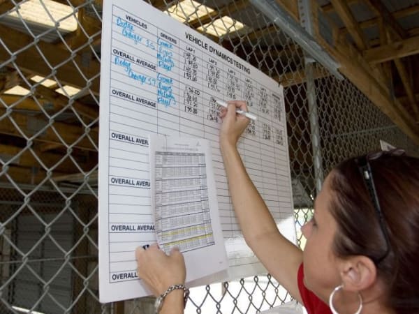 Test results are recorded with markers on large boards near the raceway. Times are marked from the five laps of four drivers of each vehicle. An overall average is taken from the scores.