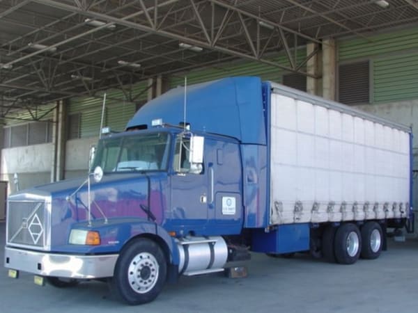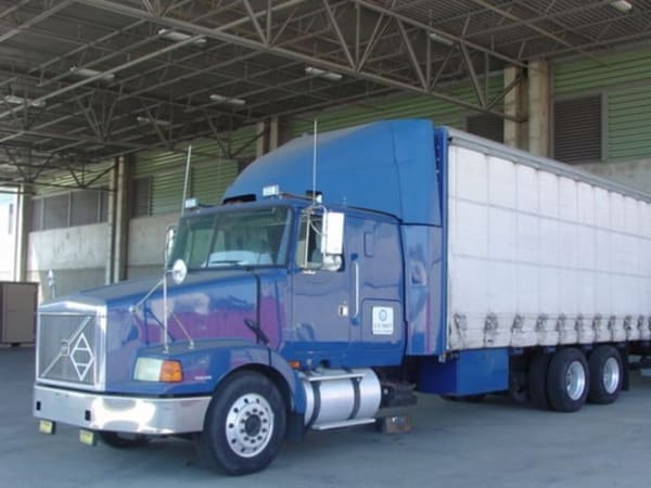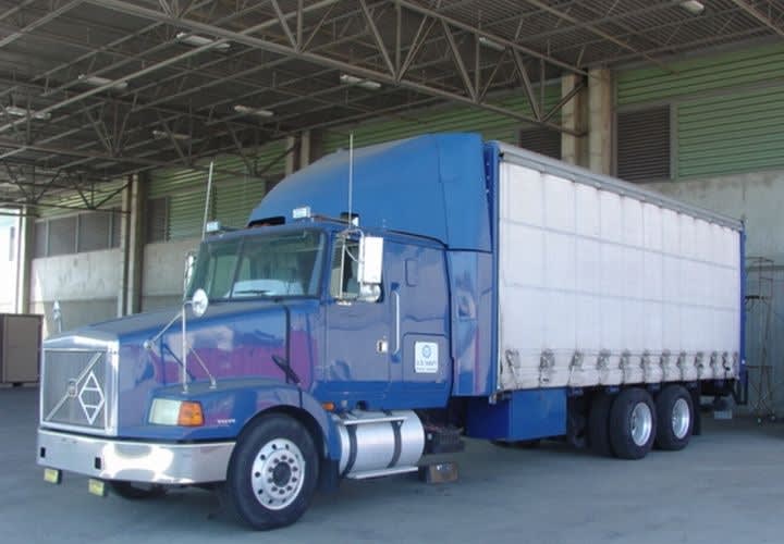 This Volvo bobtail truck arrives at a central receiving area to pick up and transport materials and equipment to substations.
