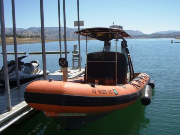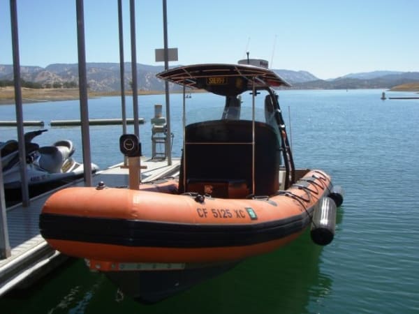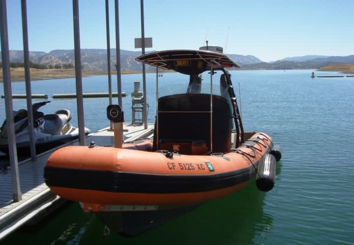 This 15-foot inflatable F470 Zodiac boat is a rigid-hull inflatable with a canopy, tracking beacon and public address system to engage intoxicated revelers on the lake.
