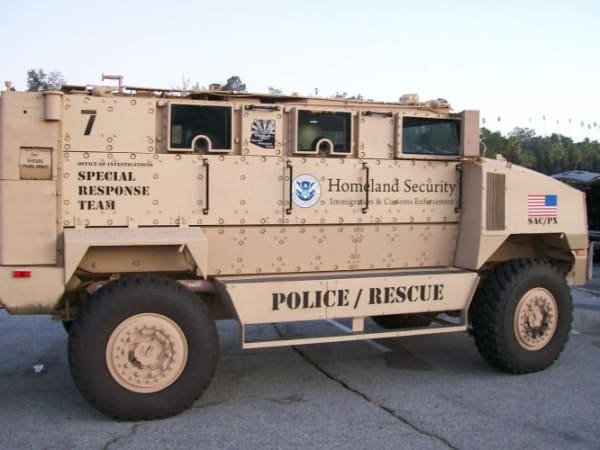 This Mine Resistant Ambush Protected (MRAP) armored vehicle is used by Homeland Security's Special Response Team. The 14-ton armored truck is much more protective of crew than a HMMWV if hit with an explosive device.