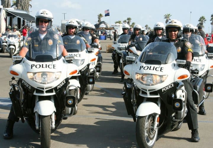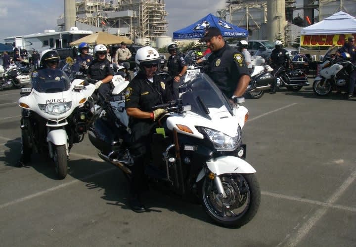 Members of the Oxnard Police Department's motor unit prepare to leave the event on their BMW R1200 RT-P bikes.