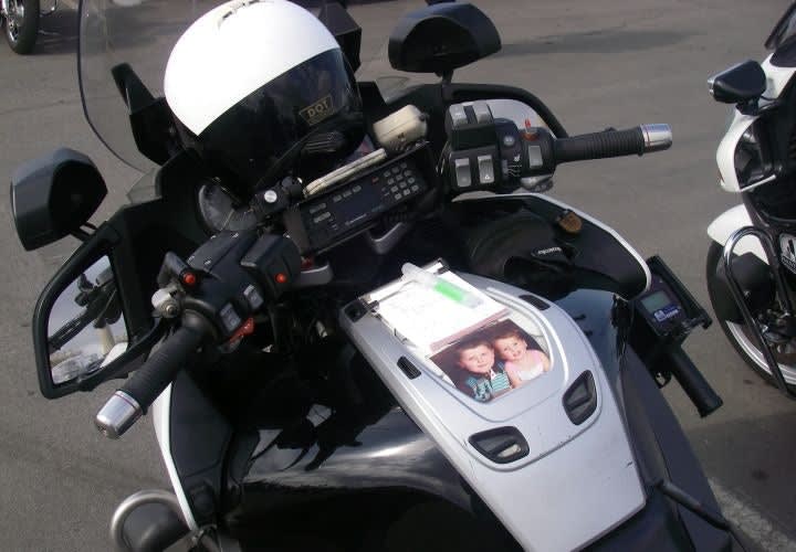 One officer personalized his bike with a picture of his two children. Officers can usually add small stickers, photos and accessesories to their bikes that are within departmental policy.