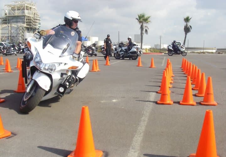An officer takes a sharp turn while running through a cone pattern. Judges marked off points for hitting a cone, putting a foot down or dropping the bike. Two judges stood on either side to watch for infractions.