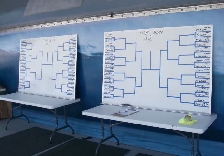 A pair of whiteboards show the 64-rider bracket of competitors for "top gun" status. Officers who won riding duels moved on to the next round. Eventually Brian Cline from the Riverside County Sheriff's Department emerged as the top rider.