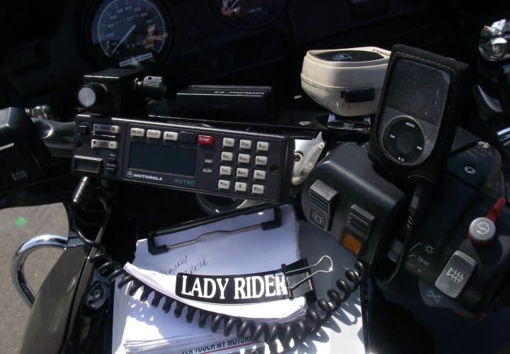 Several officers personalized their bikes, such as Irene Gomez of the Santa Ana Police Department. A "Lady Rider" sticker is clipped to her notepad, along with an iPod integrated with the bike. A second sticker not visibile here read "Yes, it's fast. No, you can't ride it."