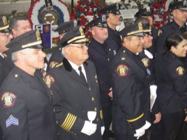 Officers salute VIP arrivals and survivors as they enter the memorial plaza. Photo by David Griffith.