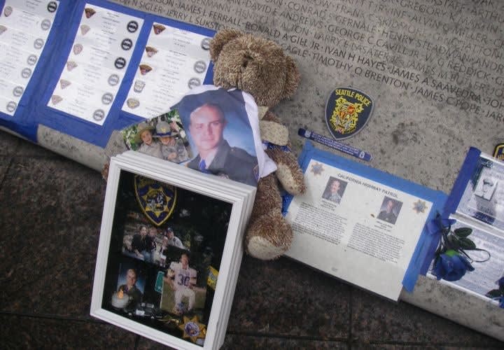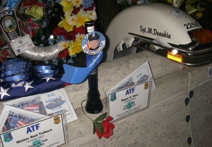 Sgt. Mark Dunakin was one of four Oakland Police officers killed by a parolee. A piece of Dunakin's motorcycle and his duty flashlight rest near his name.
