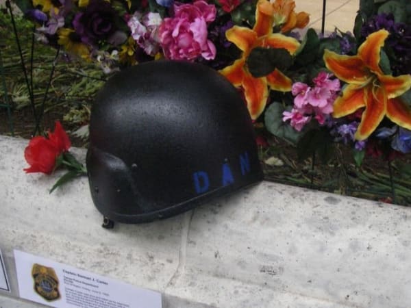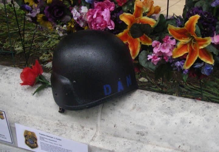 A SWAT operator's helmet bearing only the name of "Dan" and a rose are reminders of a tactical officer.