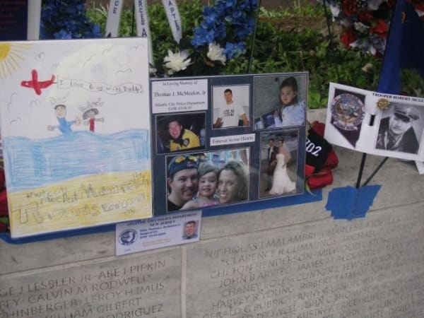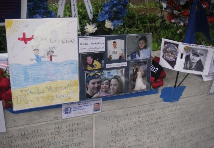 A child's drawing of happier times and photos of an officer's family are among the items left at the wall.
