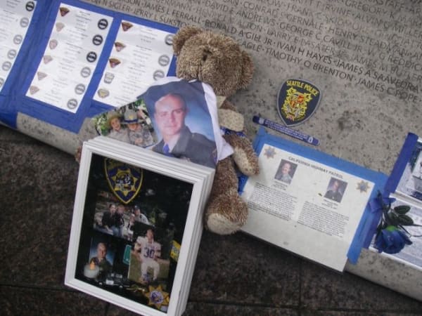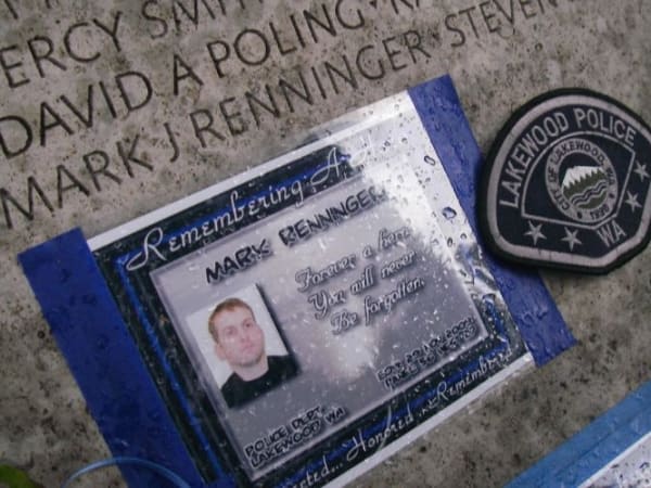 Sgt. Mark Renninger was one of four Lakewood (Wash.) Police officers killed during a coffeehouse ambush. A department patch accompanies the placard stating, "Forever a hero, you will never be forgotten."