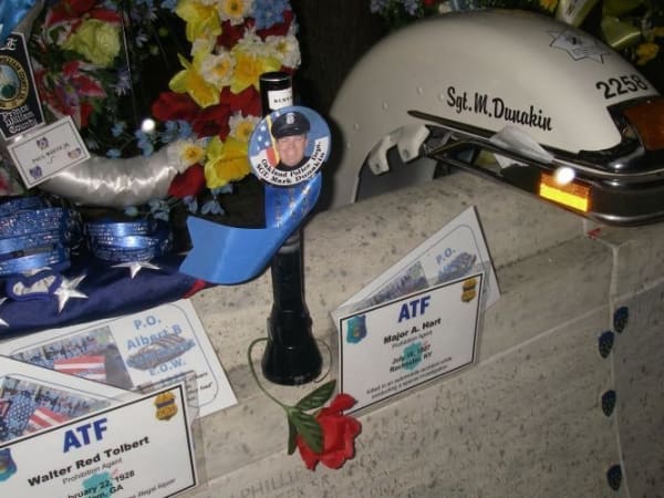 The names of almost 19,000 law enforcement men and women have been added to the curving, 304-foot marble walls of the National Law Enforcement Officer's Memorial. The officers and families who knew them arrived at the memorial during National Police Week to pay tribute by leaving roses, photos, wreaths, a SWAT helmet, a duty flashlight, and other personel items.