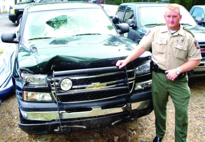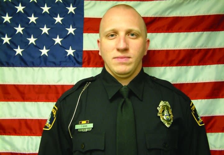 July 2010: Arriving before firefighters at a house fire, Officer Trent Ginn (pictured) and Cpl. Christopher Sturgeon went into the burning home and rescued a trapped woman. Following her screams, Sturgeon crawled along the floor to stay below the thick smoke that permeated the house as he searched for and found the woman. Ginn helped retrieve her from the house. Both officers were treated for smoke inhalation at a local hospital. The woman recovered fully.