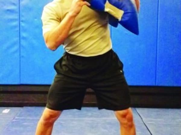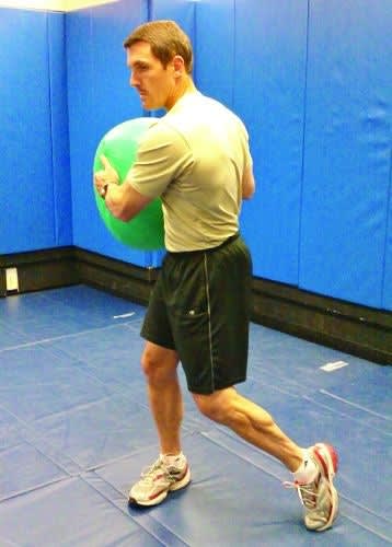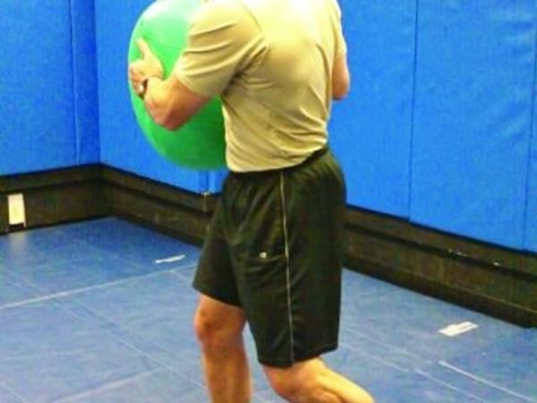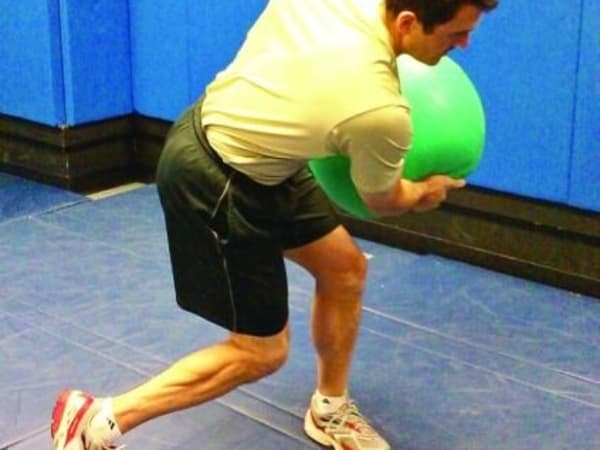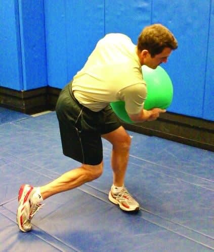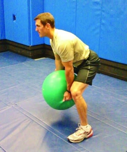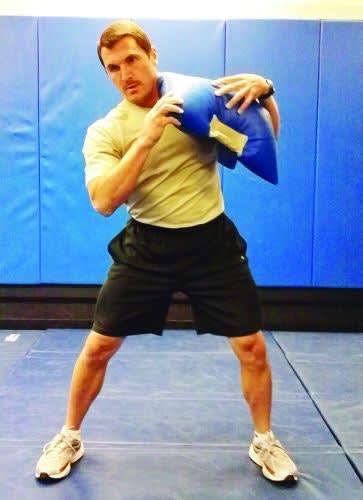 Training with water-filled objects adds another dynamic to an exercise: inertia. The following three photos demonstrate how to use this to your advantage by moving this ball in a chopping motion.