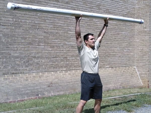 You can use a PVC pipe filled slightly with water to perform a shoulder press, as shown here. Water-filled pipes require you to push or pull evenly, forcing you to use your core to balance.