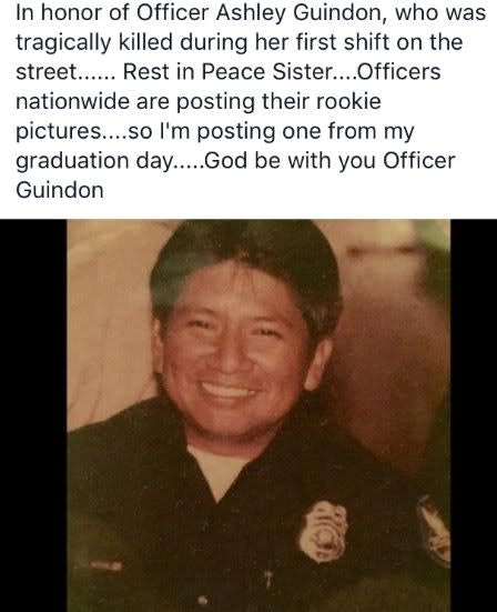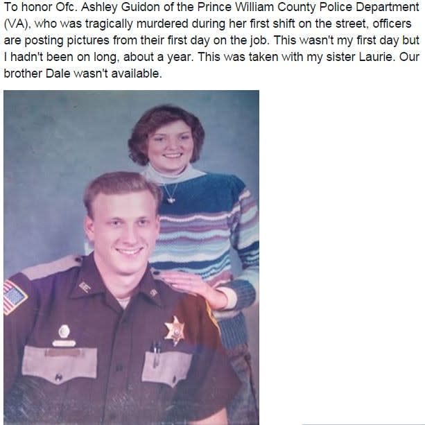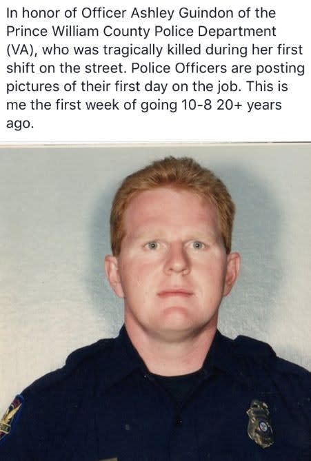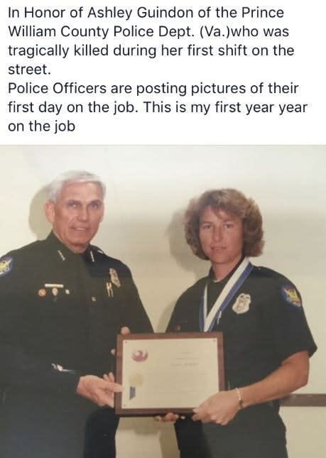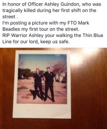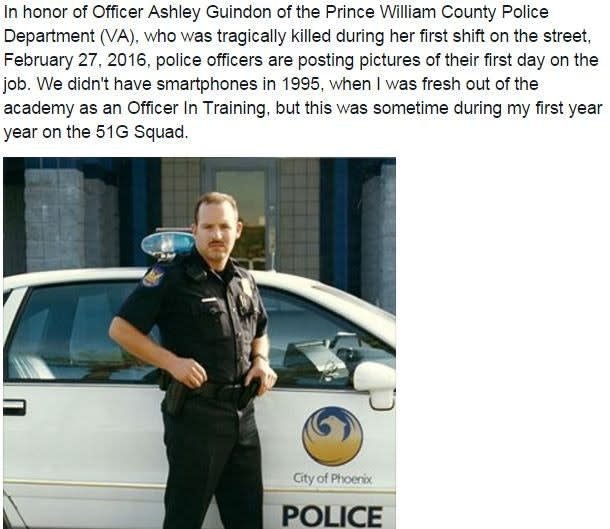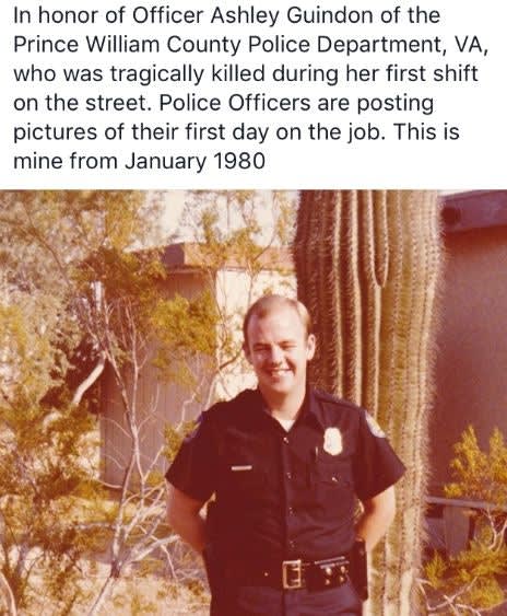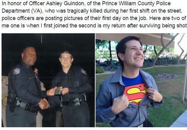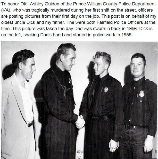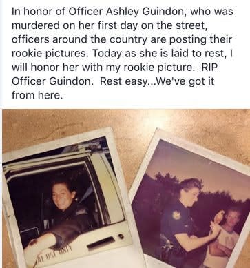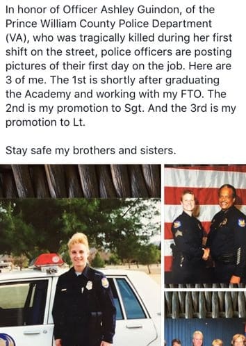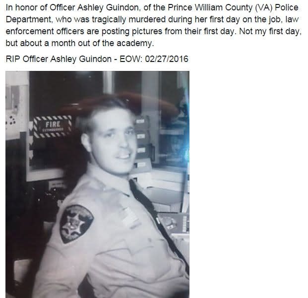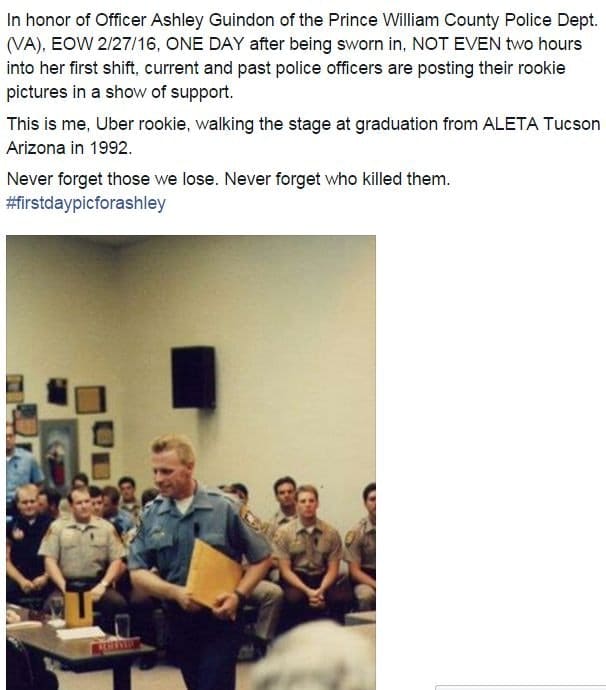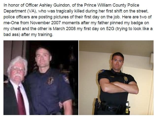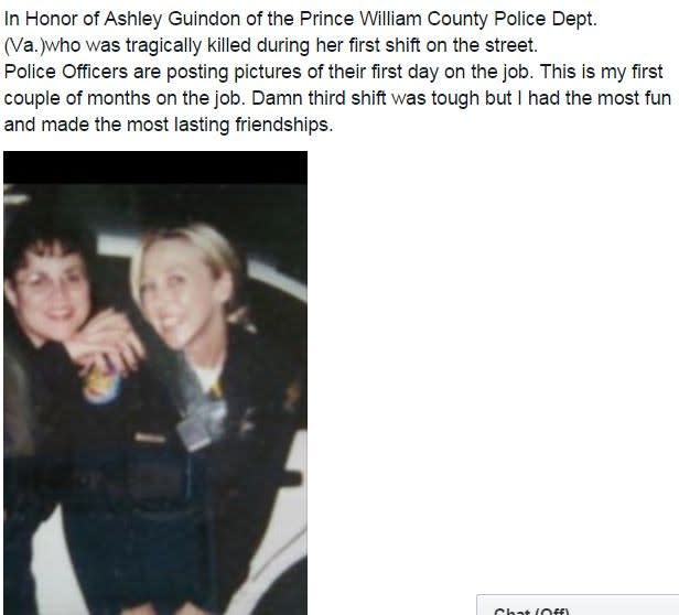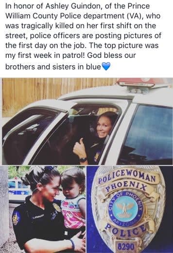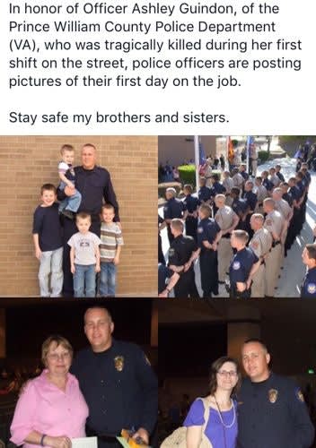 In honor of Officer Ashley Guindon of the Prince William County, VA, police, who was shot and killed her first day on the job , numerous officers nationwide have posted their first-day photos on Facebook. Here's a small sample of this tribute to Officer Guindon.
