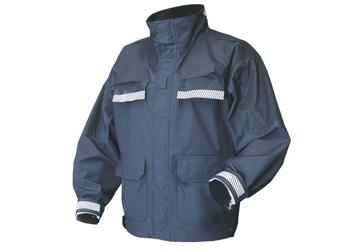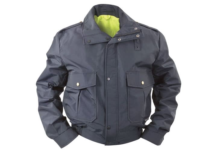 Innovative details of Elbeco's Bomber-styled Lifesaver jacket include front patch pockets with hand-warmer side-entry points and side-entry hand-warmers on the Hi-Vis side, functional mic clips, and side zipper vents for easy equipment access. Standard badge tab eyelets are attached to both the dark and Hi-Vis sides. Colors available include dark navy and black.