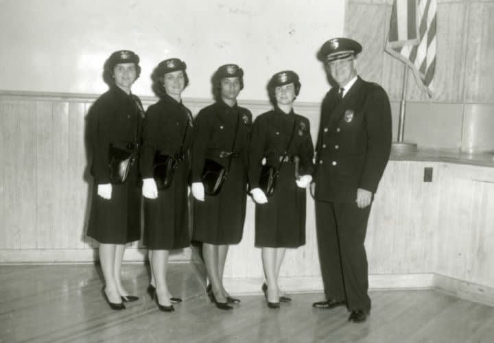 These police women are wearing Class A uniforms at the Los Angeles Police Academy's gym in the 1960s. Photo courtesy of the Los Angeles Police Historical Society.