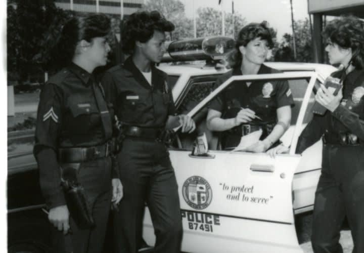 Women police officers are shown in front of Parker Center, the LAPD headquarters, during the 1980s. Photo courtesy of the Los Angeles Police Historical Society.
