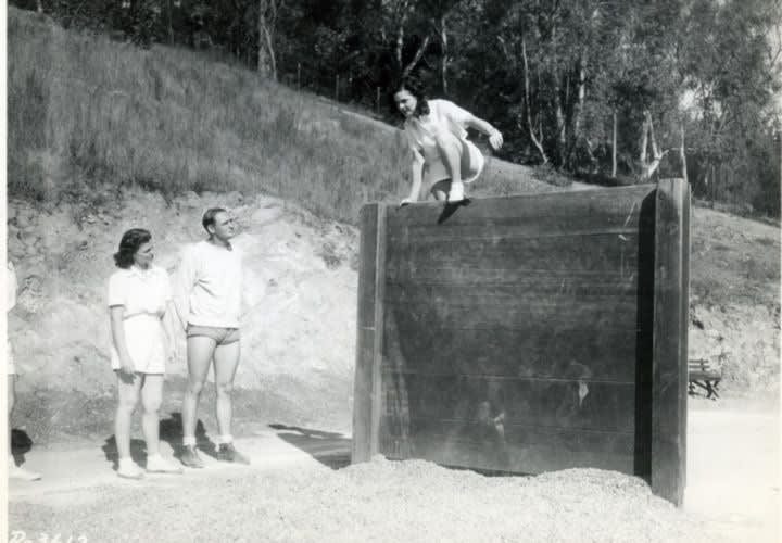 Police women scale a wall during training at the Los Angeles Police Academy's obstacle course in 1948. Photo courtesy of the Los Angeles Police Historical Society.