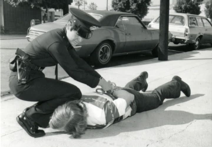 A female police officer makes an arrest in the 1980s. Photo courtesy of the Los Angeles Police Historical Society.