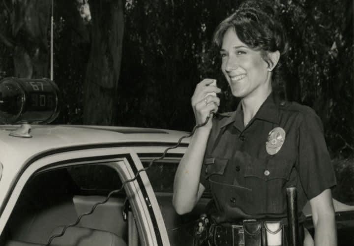 A female police officer working patrol in the 1980s uses her two-way radio. Photo courtesy of the Los Angeles Police Historical Society.