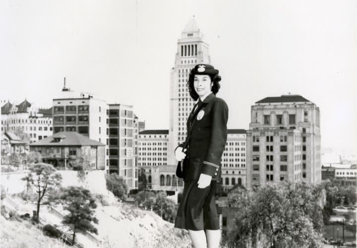 A policewoman is seen with City Hall as a backdrop in 1948. Photo courtesy of the Los Angeles Police Historical Society.