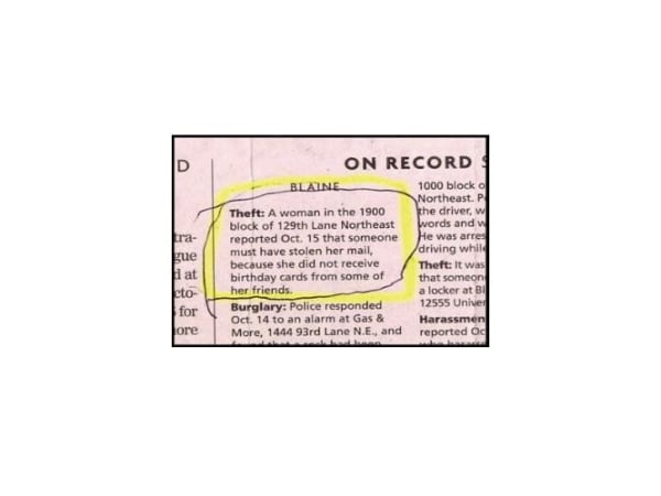 In this police blotter item from a petty theft report, a local woman called her police agency when she didn't receive enough birthday cards.