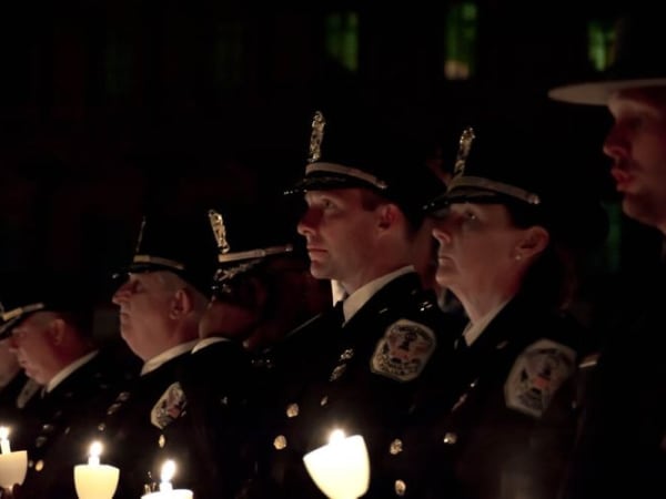 Officers with the U.S. Park Police hold their lighted candles during the NLEOMF's annual candlelight vigil. Photo: Mark W. Clark