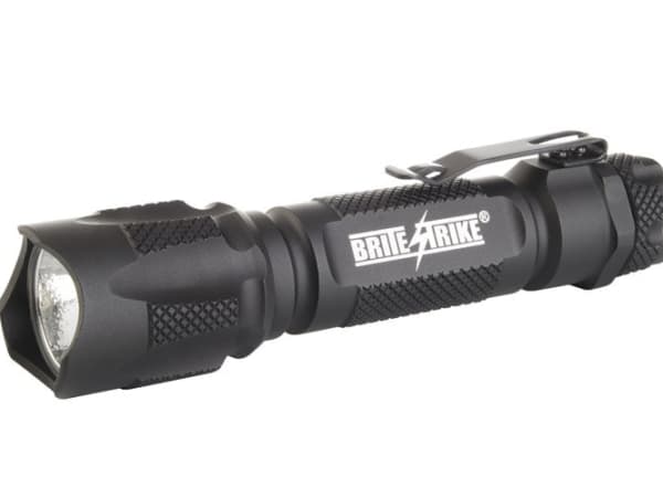 Brite-Strike's 340-lumen BDRC tactical rechargeable flashlight for 2013 is equipped with the company's patented Tactical Blue-Dot Tactical Touch HLS High Low Strobe switch. Brite-Strike pioneered the use of a one-finger, one-touch tactical strobe with its Tactical Blue-Dot Tactical Touch switch. At 5.2 inches long, the BDRC runs on both the 1860 rechargeable battery and 123A batteries as a backup. The body is CNC machined from a single billet of 6061 aluminum and hard anodized finish for a lifetime of use. The BDRC is waterproof and shockproof and features a crenelated front and rear for maximum pressure point control.