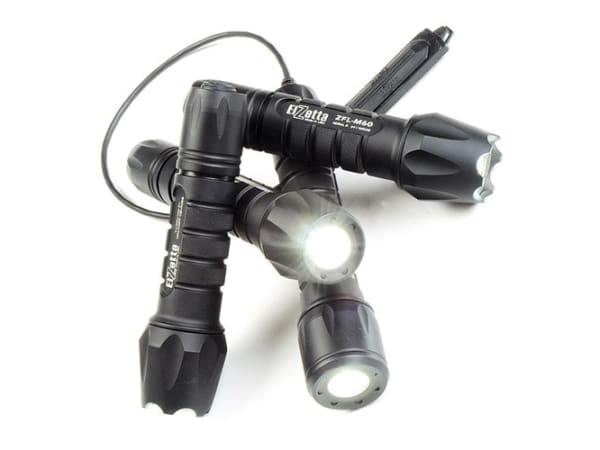 Available in 72 configurations, Elzetta's ZFL-M60 Tactical LED Light is designed so that all components are interchangeable, interoperable, and made in the USA. With fully potted electronics and half-inch-thick acrylic lenses, Elzetta flashlights are extremely durable, which is important when they're mounted on a weapon. The ZFL-M60 puts out 235 lumens of light with optical beam projection for uniform lighting. Tailcap options include rotary, clicky, high/low, high/strobe, and remote tape switch with five-inch or 12-inch cable. Other options include standard, low-profile, or crenellated bezels and two- and three-cell bodies. A set of 123A ba