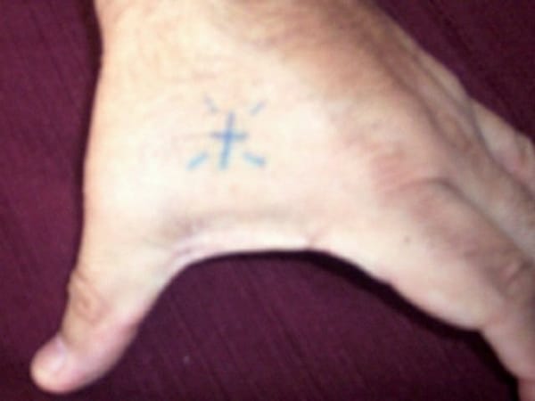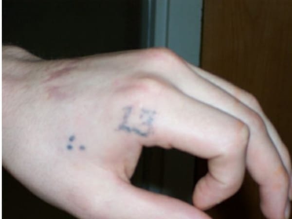 This hand shows both the "mi vida loca" tattoo and the 13 indicating association with the Southern California Surenos and the Mexican Mafia.