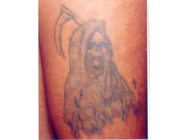 In addition to advertising gang membership, tattoos provide other details about the bearer. For the incarcerated, images of chains and locks represent the loss of freedom; an hourglass or clock face without hands indicate doing time; a string of numbers may be an inmate's prison ID; one laughing face, one crying face means play now, pay later or my happy life, my sad life; a tombstone with numbers may indicate years of incarceration; the face of a female crying usually means someone on the outside is waiting for them. Caption information provided by POLICE gang expert Richard Valdemar.