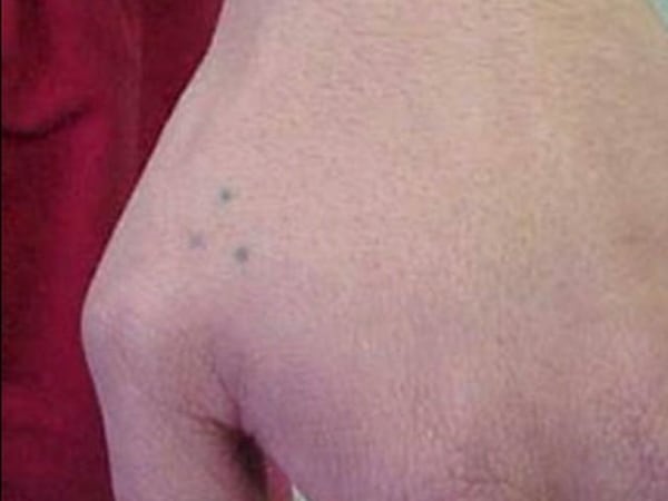 A set of five dots arranged like the face on a die can signify “criminal for life” or membership in a Crips gang.