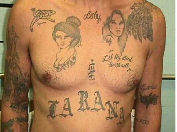 The wearer of these tattoos is one of the Infamous Grajeda family members from the La Rana (the Frog) gang and the Mexican Mafia. A simplified version of Chinese characters for "trust no man" are centered on his chest.