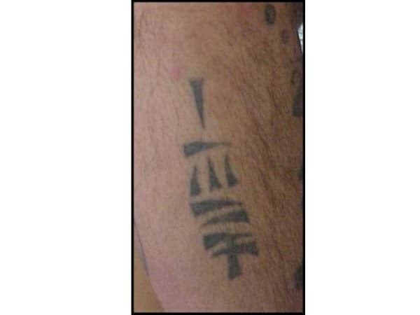There are many versions of this tattoo using several variations of simplified Chinese characters. Gang members claim that it says "trust no man," or "trust no bitch," but many don't read Chinese. They apparently must take the word of the tattoo artist.