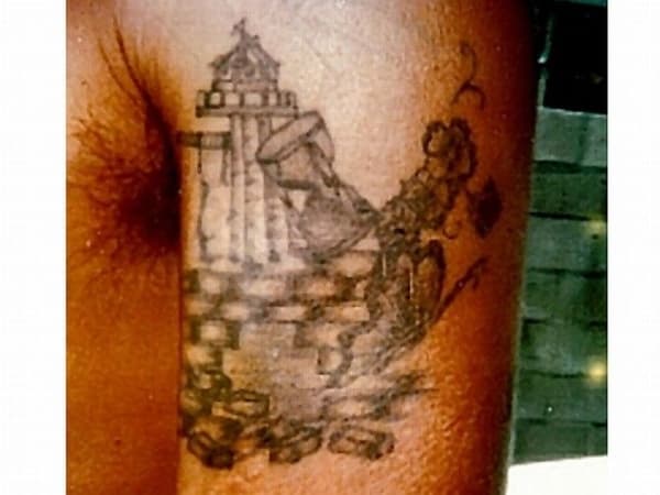 This tattoo of a prison tower, hour glass, and prisoner breaking out of the prison wall signifies this person has done prison time.