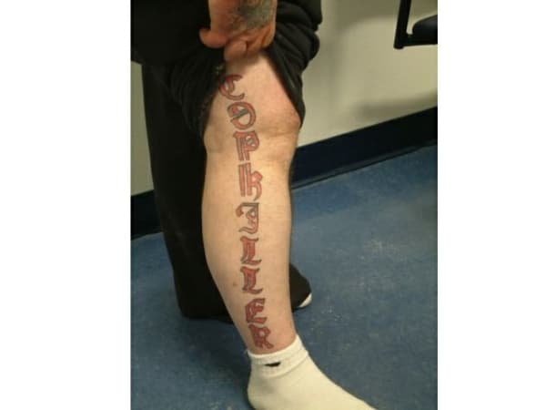 This inmate is boasting a stylized lettered tattoo bragging "Cop Killer." It's placement is odd, because if he really wanted it to be seen, it wouldn't be on a leg (normally covered by clothing), in colored ink (prison tattoos are almost exclusively done in black ink), and in a difficult-to-read style. It may be a store-bought tattoo that was done before he was arrested.