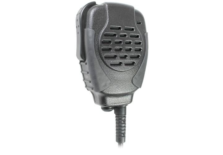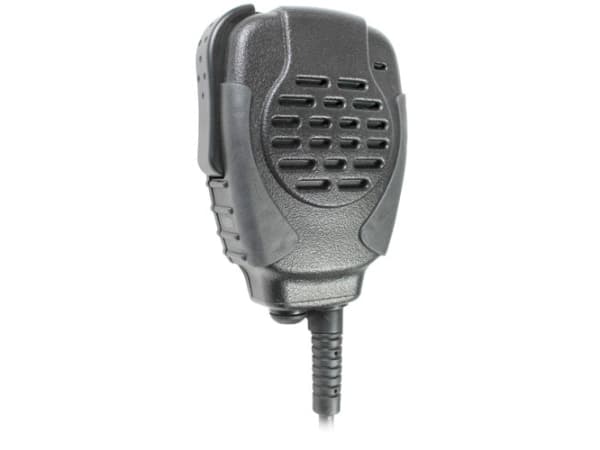 The Pryme SPM-2200 Series Trooper II is a weatherized remote speaker microphone for two-way radios. Its high-impact housing is sealed against both dust and liquid and meets both IP56 and MIL-STD 810 ratings for water resistance and durability. It uses a military-grade cable with a tough polymer jacket on the outside and Kevlar reinforcement inside. The Trooper II has a loud speaker, a strong clothing clip, a noise-cancelling microphone for clear transmissions, and an earphone jack for private listening. The microphone is available to fit many portable radios including Motorola, Kenwood, Icom, Harris, and others.