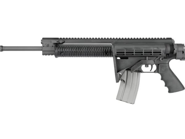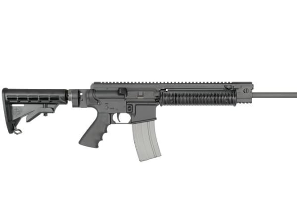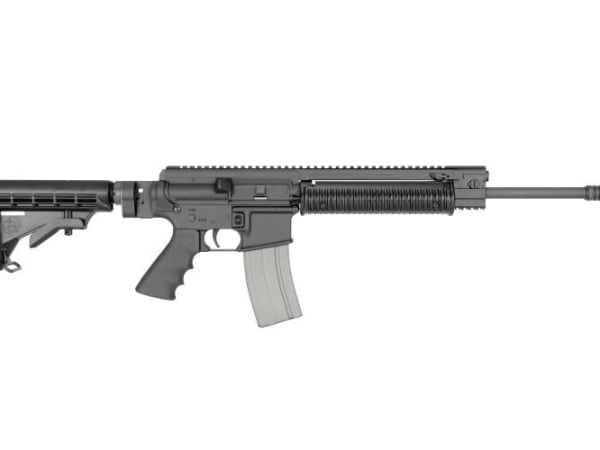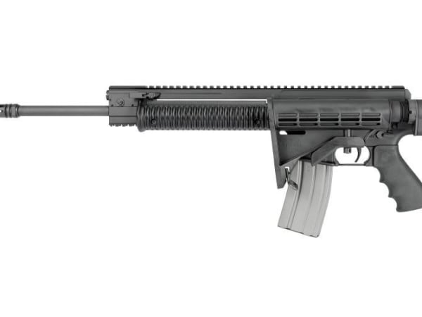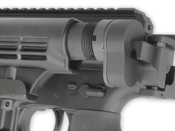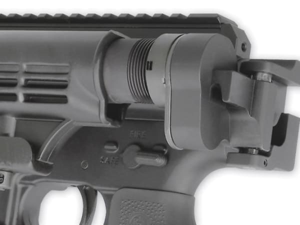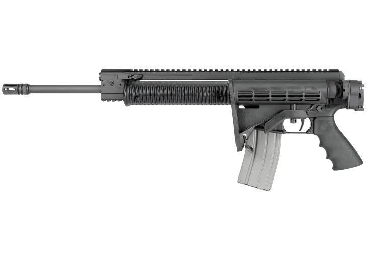 The carbine is shown here from the reverse angle with the stock folded onto the side of the upper receiver. This feature reduces length, allowing the weapon to be more compact for storage in the trunk of a patrol car. The carbine arrives with a 16-inch chrome barrel (1:9 twist) and weighs 7.4 pounds.