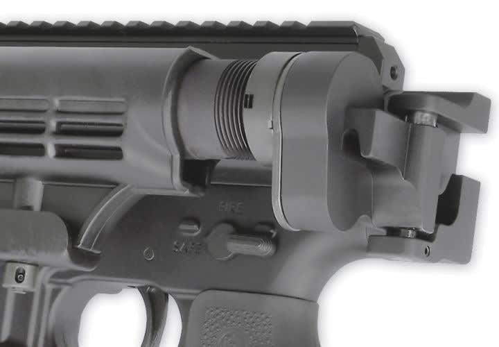 The PPS operating system allows for the elimination of the traditional AR-receiver extension (containing the action spring and buffer) behind the lower receiver. The side-folding stock adaptor allows for the use of any AR-style stock on the PPS carbine (Rock River's six-position Tactical CAR is standard). Adaptors for other types of stocks are planned.