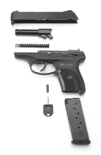 Ruger's sub-compact pistol features a glass-filled nylon frame with an alloy insert and a blue-steel slide. The thumb safety, magazine release, slide stop, and take-down catch are all located in the proper places.